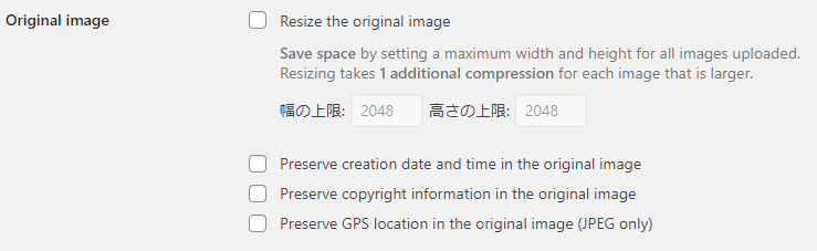 Resize the original image Save space by setting a maximum width and height for all images uploaded. Resizing takes 1 additional compression for each image that is larger. 元の画像のサイズを変更する アップロードされるすべての画像の最大幅と高さを設定します。 サイズ変更には、より大きな画像ごとに 1 回の追加圧縮が必要です。